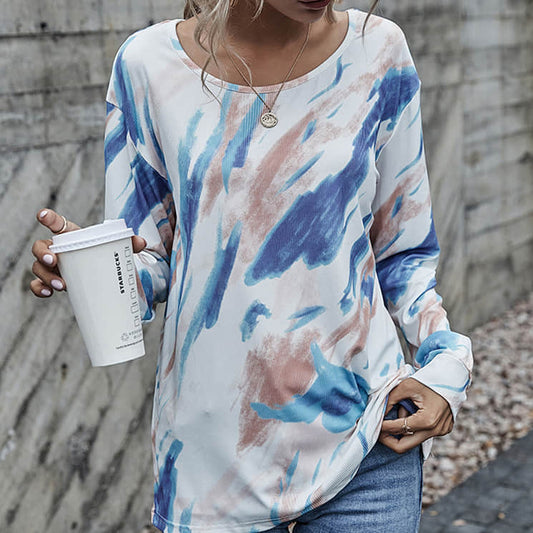 Blue graffiti long-sleeved stitching loose and thin pullover round neck women's T-shirt