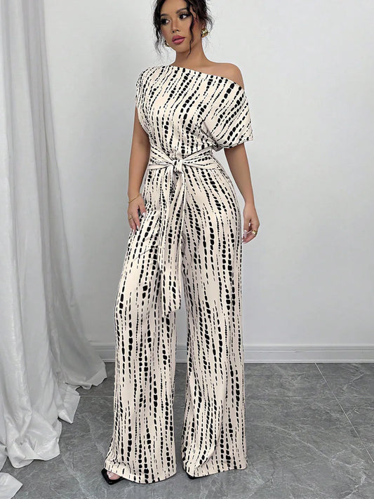 Striped Off-shoulder Strap Wide-leg Jumpsuit