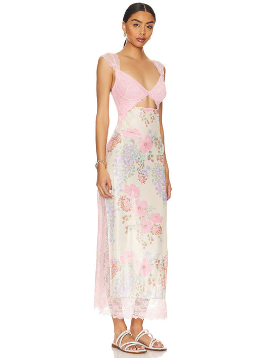 Lace Backless Strap Splicing Floral Long Dress