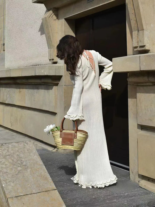 Pleated Ruffled Backless Long Sleeve Dress