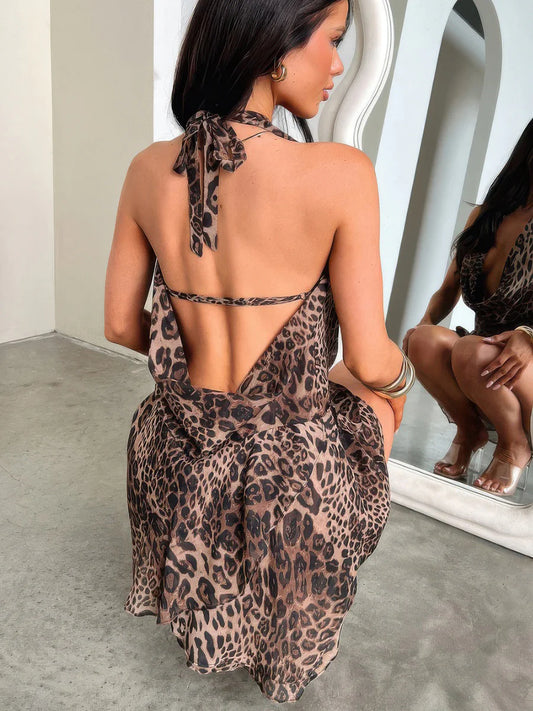 Backless Leopard Print Halter Dress