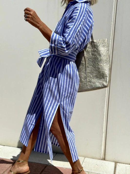 Regular price $37.70Regular price $37.70Unit price / per$45.00Sale priceThree-quarter sleeve striped cardigan lapel shirt dress