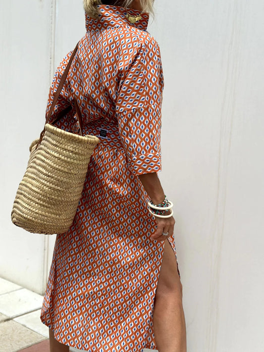 Five-quarter Sleeve Rhombus Cardigan Lapel Shirt Dress