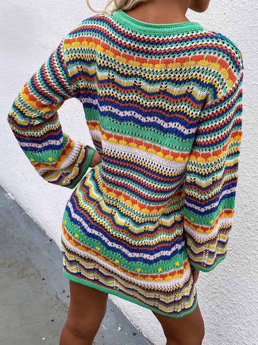 Round Neck Colorful Stripe Knitted Dress Mid Length Women's Sweater