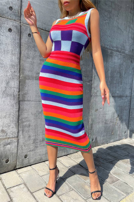 Sleeveless colorblock check stripe slim dress sweater