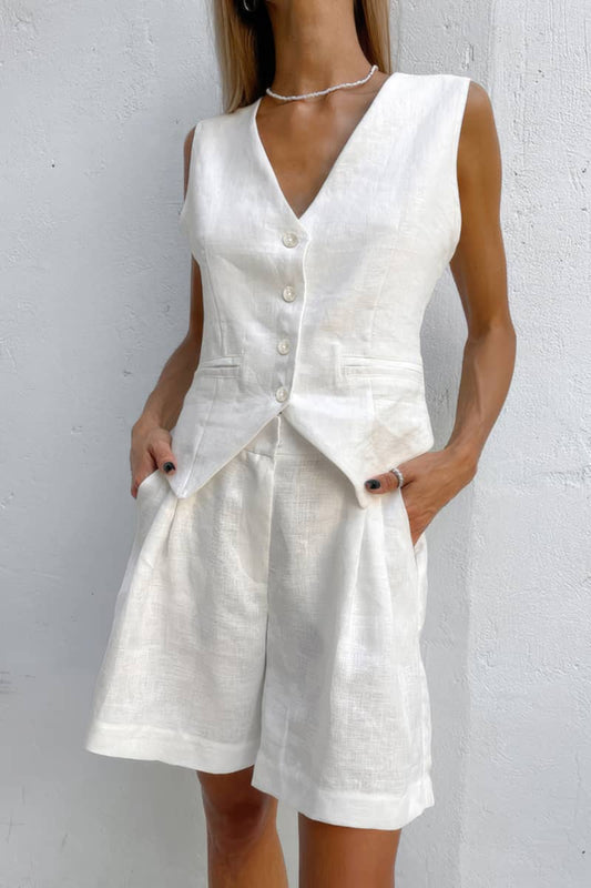 Long Sleeve White Shirt Top Cotton Linen Shorts Casual Suit