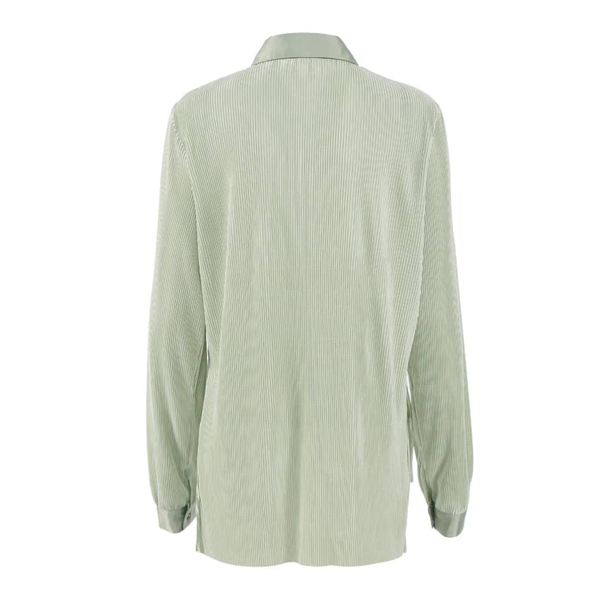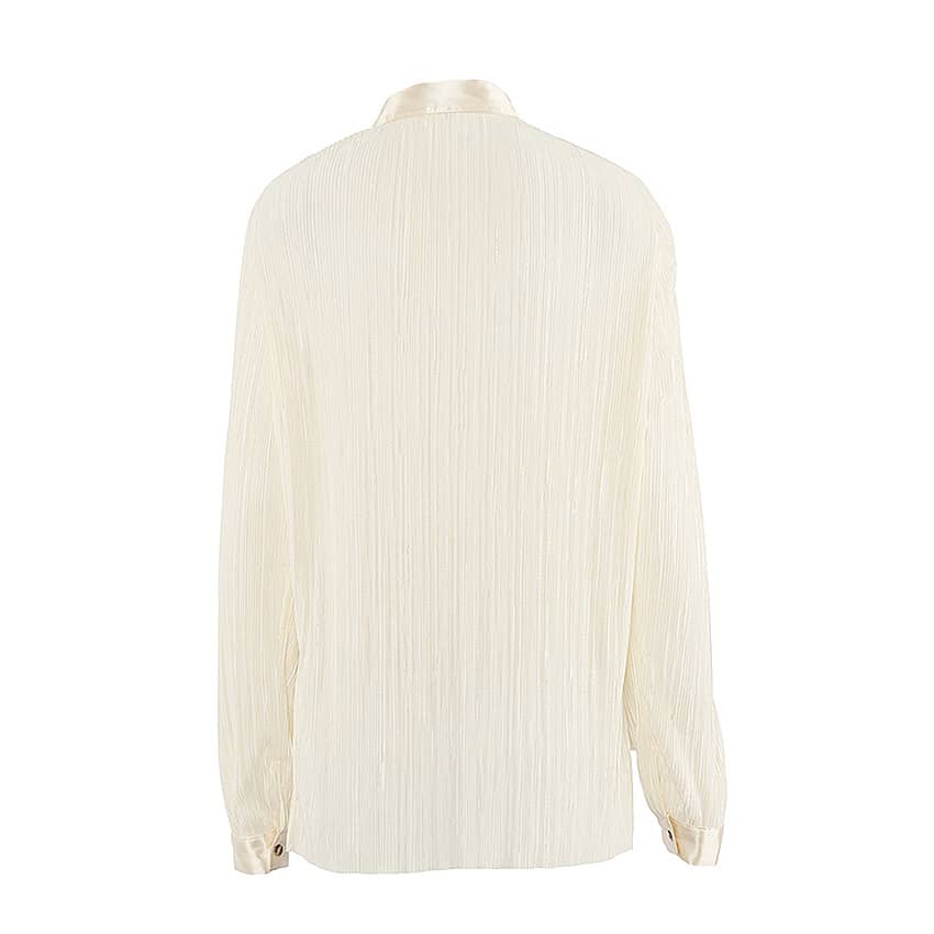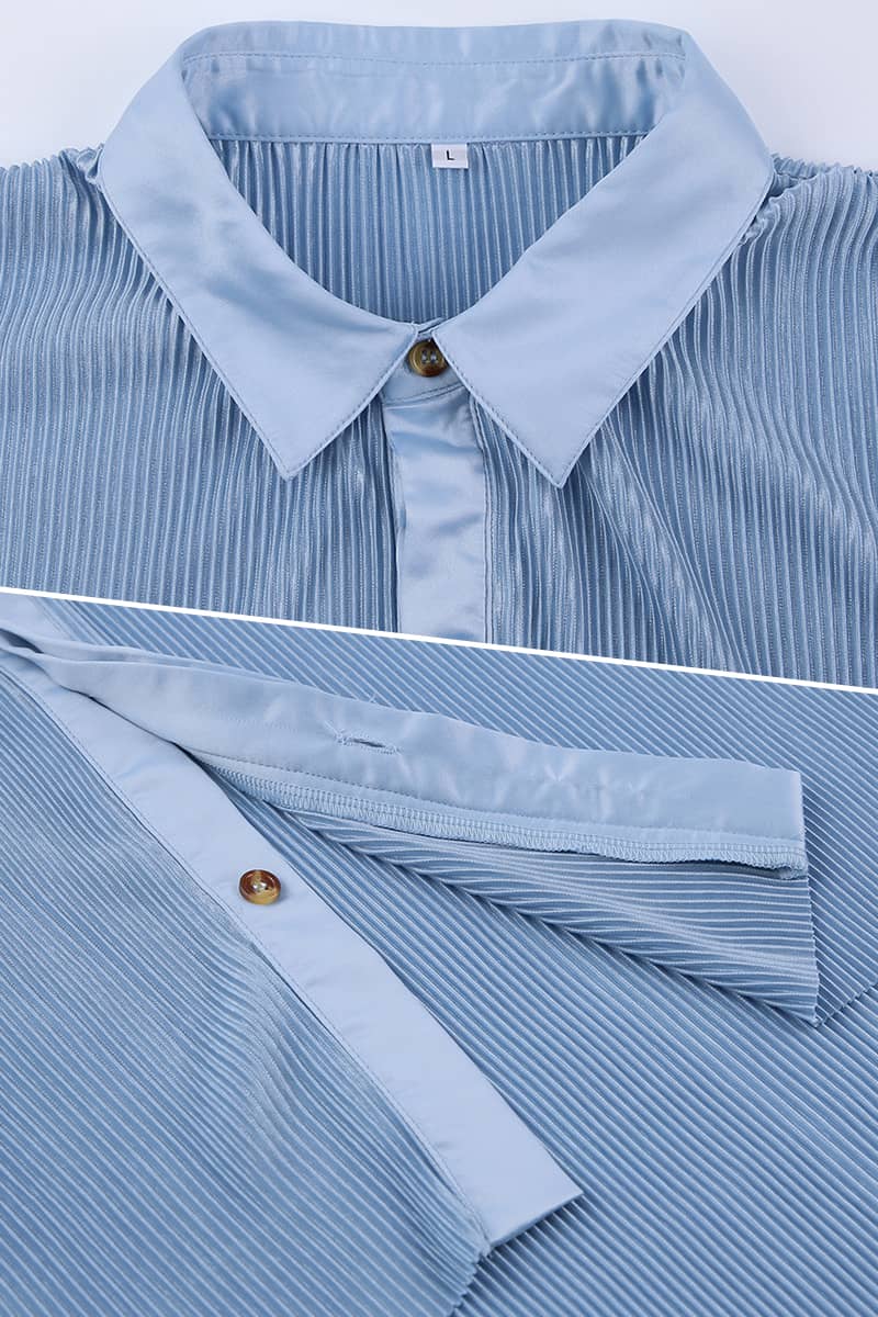 Long-sleeve lapel pleated shirt wide-leg floor-drape pleated trousers.