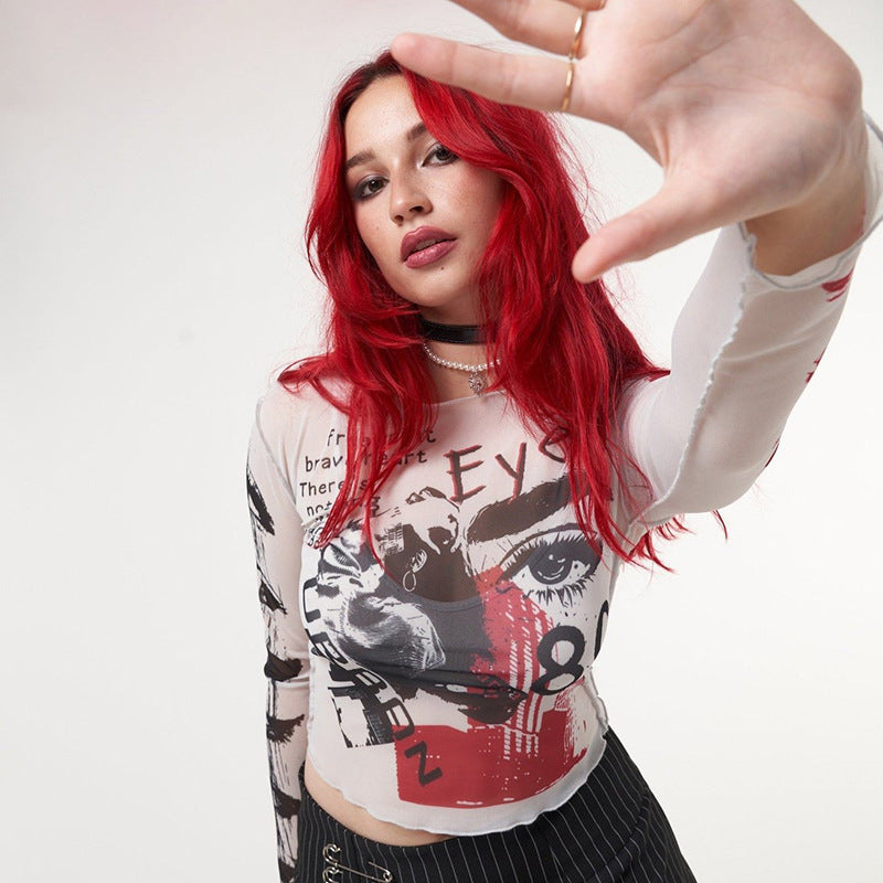 Mesh printed navel exposed casual long-sleeved T-shirt