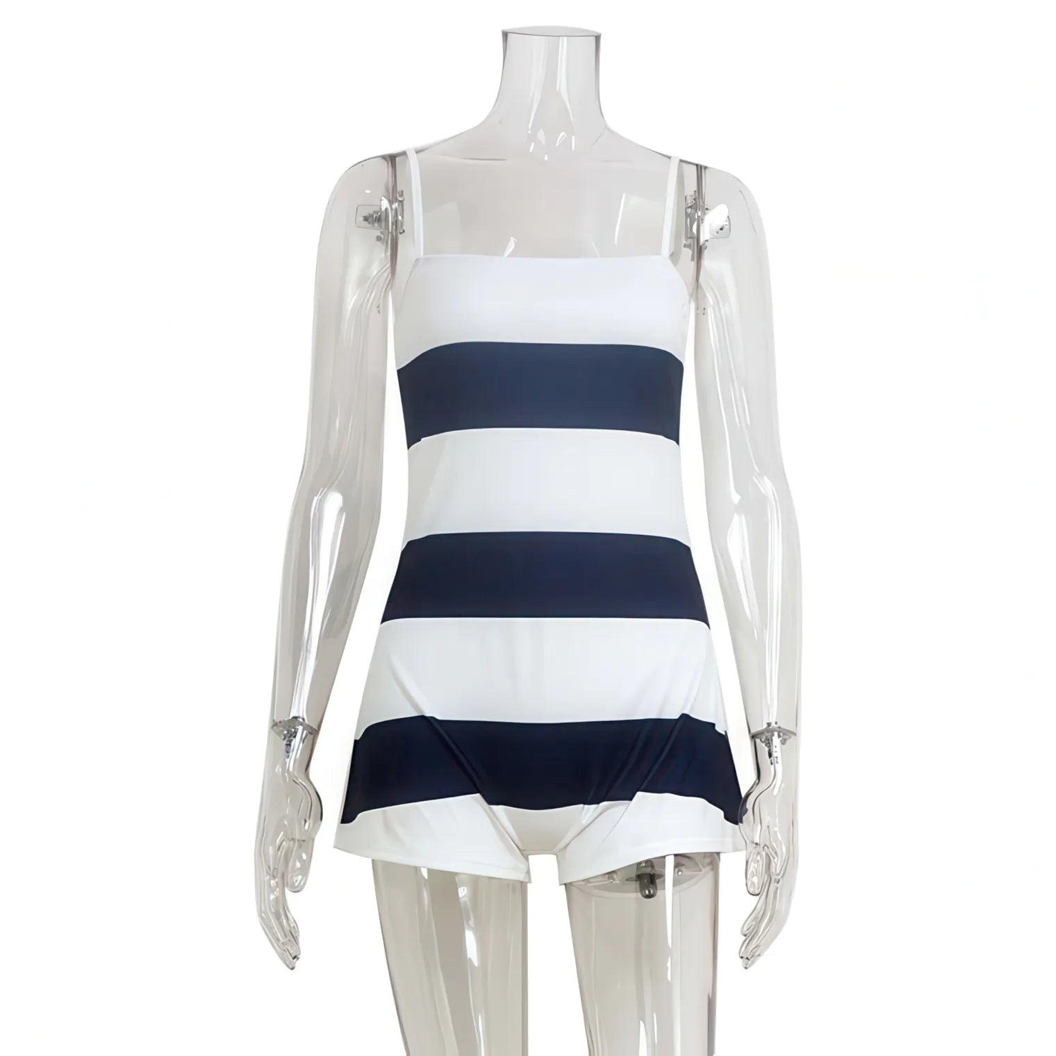 This sleeveless suspender striped romper is a versatile and stylish addition to any wardrobe. Made with high-quality materials and a flattering fit, it can easily be dressed up or down for any occasion. The sleeveless design provides comfort and breathability while the suspenders add a touch of uniqueness. Perfect for a casual day out or a night on the town.